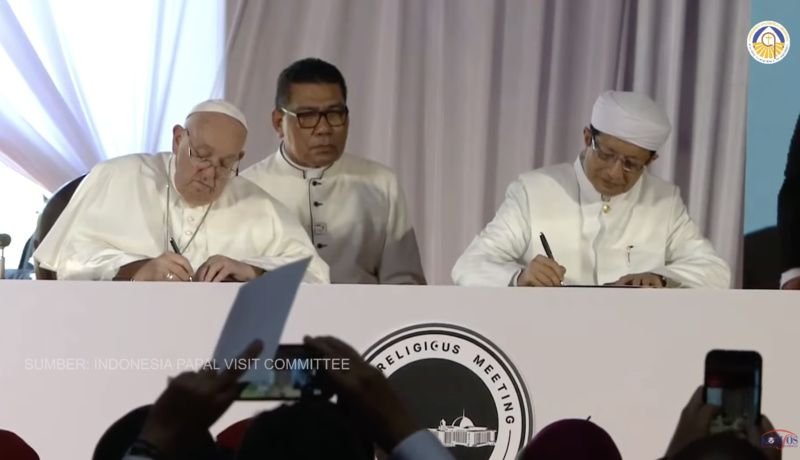 Jakarta – Paus Fransiskus hari ini telah meneken Deklarasi Istiqlal bersama Imam Besar Masjid Istiqlal Nasarudin Ummar. Deklarasi itu disepakati dalam kunjungan Paus Fransiskus ke Terowongan Masjid Istiqlal-Gereja Katedral pada Kamis, 5 September 2024.